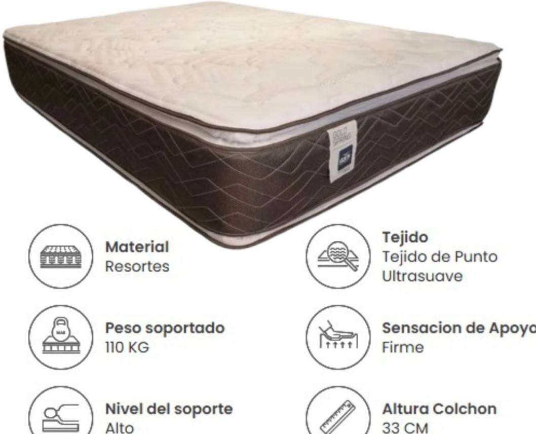 Colchón Estructura de resortes Bonnell templados, estabilizadores fixing, tecnología Posture Axis de refuerzo lumbar para protección de postura. Doble Pillow Top Plus. Manta adicional de espuma que eleva la sensación de confort en ambas caras del colchón CARACTERÍSTICAS – Con tecnología Posture Axis de refuerzo lumbar – Corazón de resortes bicónicos templados electrónicamente. – Marco perimetral de acero con estabilizadores Fixing. – Diseñado para poder ser dado vuelta. – Con DOBLE Pillow Top Plus. – Tela Jackard totalmente matelasseado MEDIDAS – Largo: 190 cm – Ancho: 140 cm – Altura: 33cm – Garantía 5 años - 110kg x lado